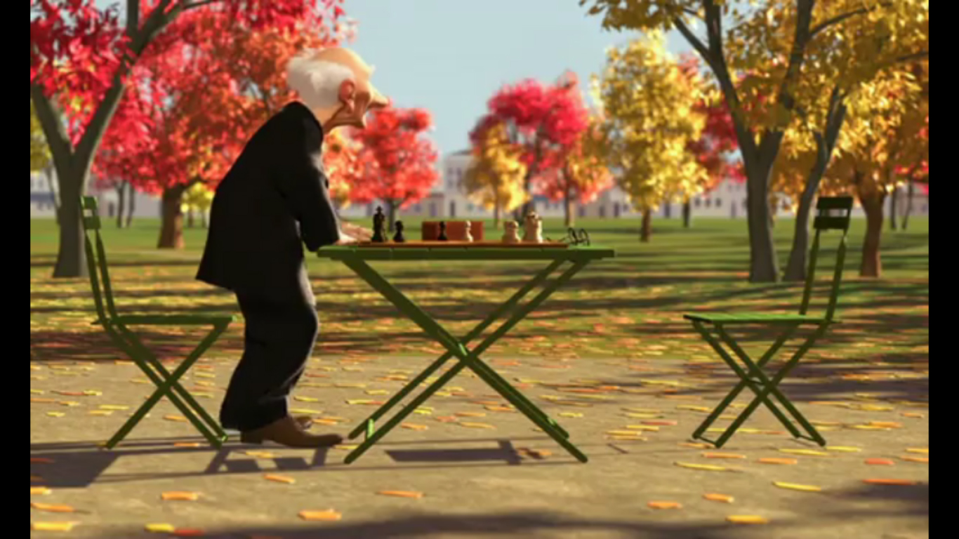 As you begin watching this film, you have the basic idea that this character is going to play a game of Chess. However, it soon became evident from this shot what exactly was going on. You can see that in fact this character is going to play against himself. As with a vast amount of Pixar animations, humour is evident in ways that you probably wouldn't expect and this is a prime example within 'Geri's game'. From this one image I can determine what the rest of the story would entail.